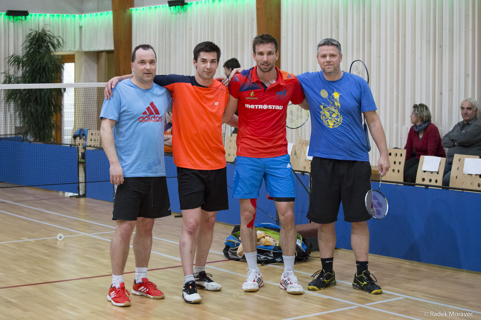 Zhruba po hodině hry nabídli tito dva pohodáři vem přítomným odválivcům společnou hru na kurtu. Uvolněná atmosféra přímo vybízela k tomu, postavit se po bok Petrovi či Jarovi a změřit s nimi své síly. Po chvíli se v hale vyrojila spousta zájemců s nachystaným vercajkem, včetně naich. Postupně se vystřídali vichni - od nejmeních hráčů a po veterány a nikdo nebyl oizen. Petr pro větí názornost komentoval svoji hru a dal tak poznat vem adeptům badmintonového mistrovství jejich slabá místa a rezervy.